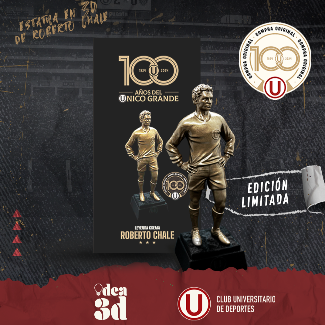 Rinde homenaje al gran ícono del fútbol peruano, EL NIÑO TERRIBLE Roberto Chale, con esta impresionante estatuilla oficial en colaboración con el Club UNIVERSITARIO DE DEPORTES. Hecha con detalles meticulosos y un acabado excepcional, esta pieza captura la esencia y el espíritu del futbolista que dejó una huella imborrable en la historia del deporte en Perú. Con una postura dinámica y expresiva, esta estatuilla refleja su dedicación, pasión y amor por el fútbol.